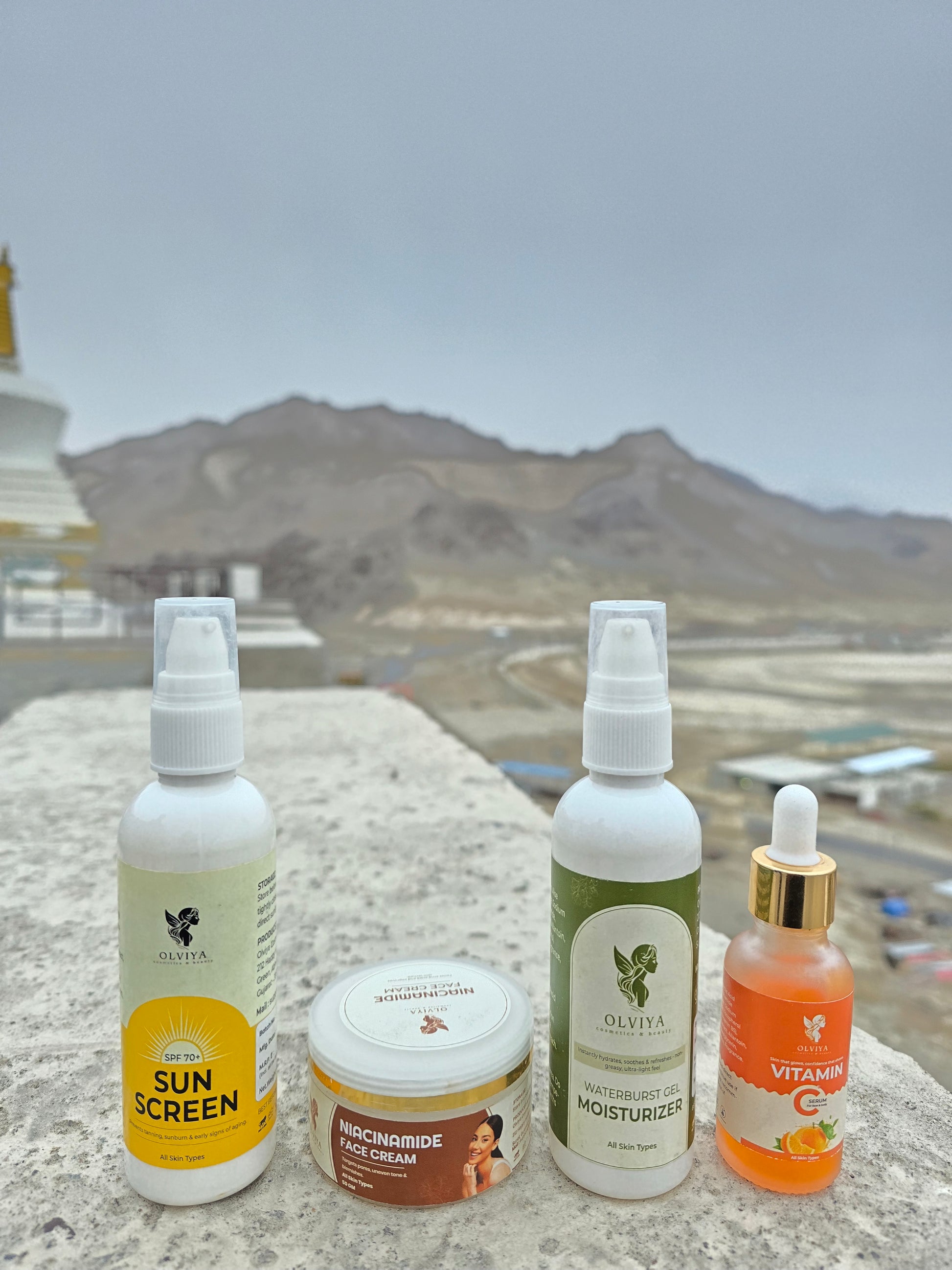 Olviya - Cosmetics & Beauty - All in One Combo Pack - Vitamin C Serum 30ml, Niacinamide Cream 50gm, Sunscreen 100ml & Moisturizer Gel 100ml.